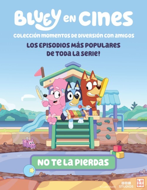 Bluey en el cine: Playdates with Friends Collection es una experiencia cinematográfica de una hora de duración que incluye ocho episodios de las tres series del programa, todos ellos dedicados al juego, la imaginación, la amistad y la familia. La recopilación reúne algunos de los juegos más queridos de Bluey, como Shadowlands y Octopus, al tiempo que destaca momentos especiales de amistad en episodios como Circus y Slide, y ofrece un montón de alegría, risas y diversión en pantalla grande para el público de todas las edades.